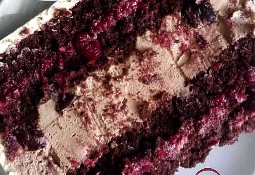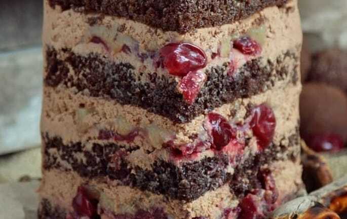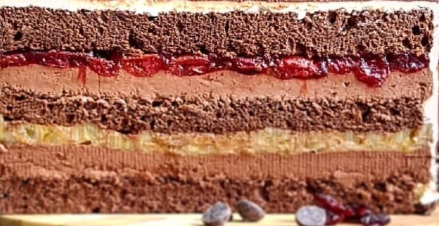 Шоколадный мусс, крем чиз , конфи из пряной вишни на насыщенных шоколадных бисквитах.