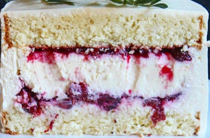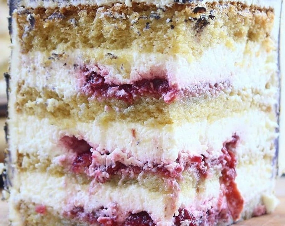 Очень нежный ванильный бисквит, пропитанный сиропом в сочетании с кремом из мягкого сливочного сыра Mascarpone, взбитых сливок и прослойкой из вишнёвого конфитюра.
