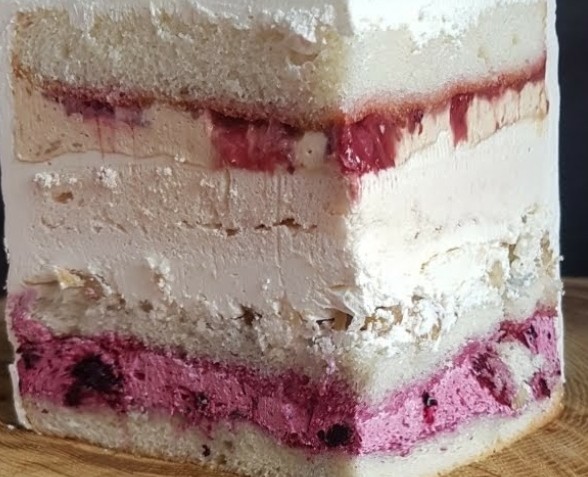 Нежный ванильный бисквит пропитанный талым мороженым, прослойка крема на основе сыра маскарпоне с клубникой. Йогуртовые сливки с черной смородиной. Карамельные сливки с малиной. Прослойка вишневого конфи. Изюминкой торта является прослойка хрустящего безе в обрамлении сливочного крема с орешками.