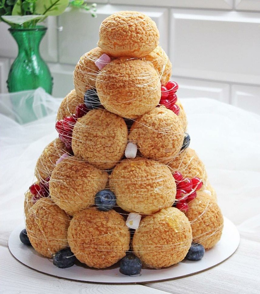 Крокембуш из профитролей с кремом патисьер (заварным) или кремом на основе сыра маскарпоне . В каждую из пироженок мы можем добавить ягоды (по сезону). Горка из заварных пирожных скрепляется между собой молочным или горьким шоколадом. (По желанию карамелью)