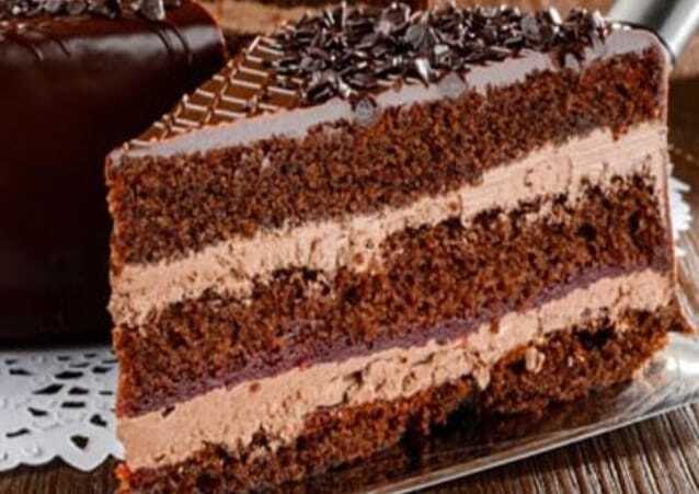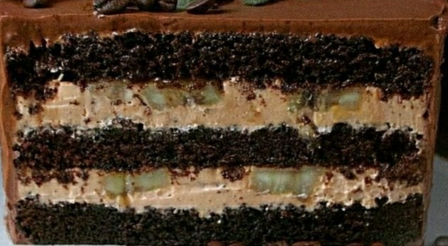 Влажный шоколадный бисквит, абрикосовая пропитка, шоколадный крем.