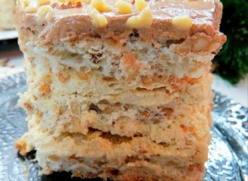 Бисквит с грецким орехом, кофейный крем, ириска, сливочный крем.