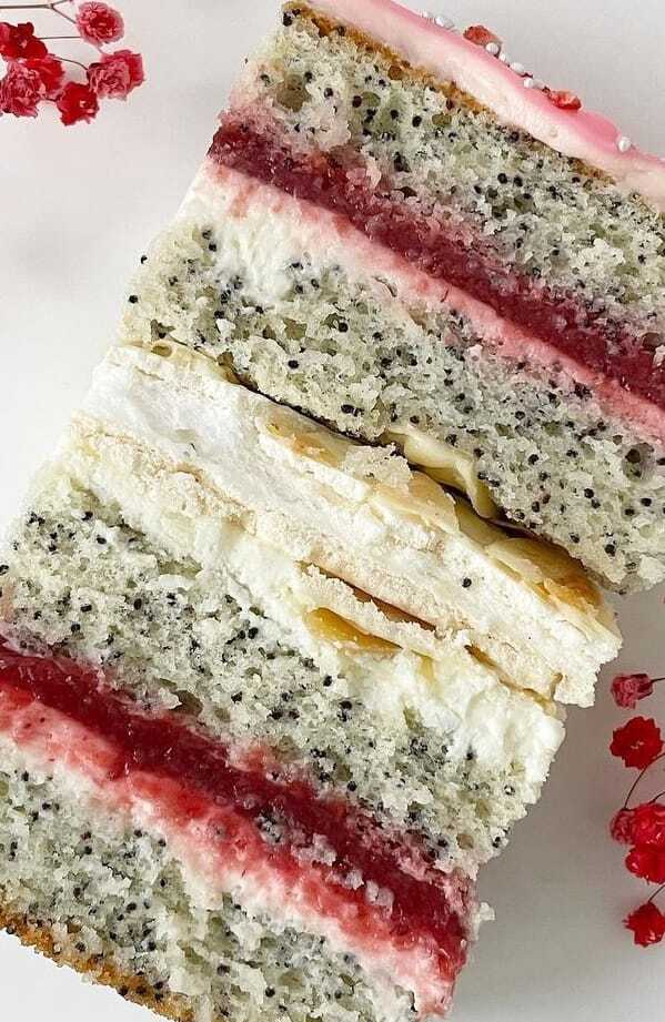 Маковые бисквиты, клубничное Кули, безе, миндаль, сырный крем с ванилью.