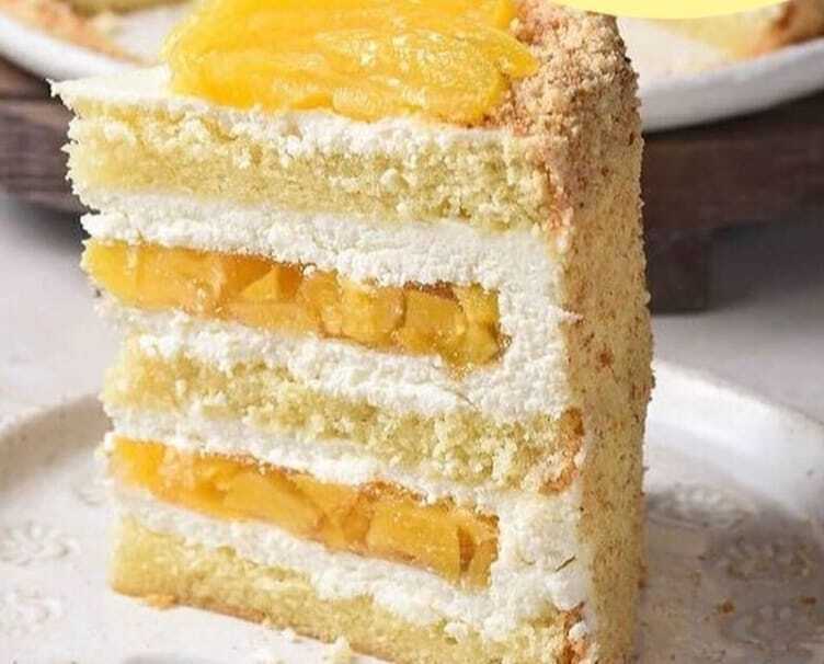 Пушистый бисквит с лимонной пропиткой. Лёгкий творожный крем , персиковая прослойка.